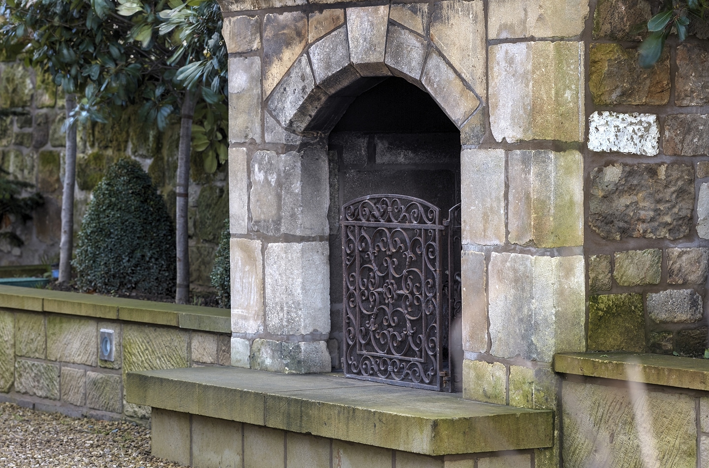 The extensive landscaping included raising the existing ground levels to create a flush finish with the kitchen extension. The raised flower beds are constructed with hand dressed stone from the local quarry and include an external fire place as the focal point of the entertaining area.